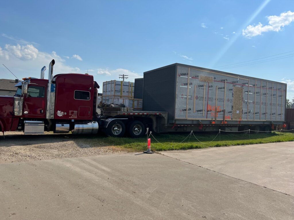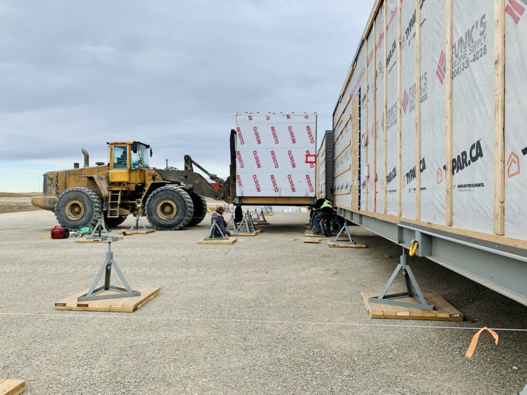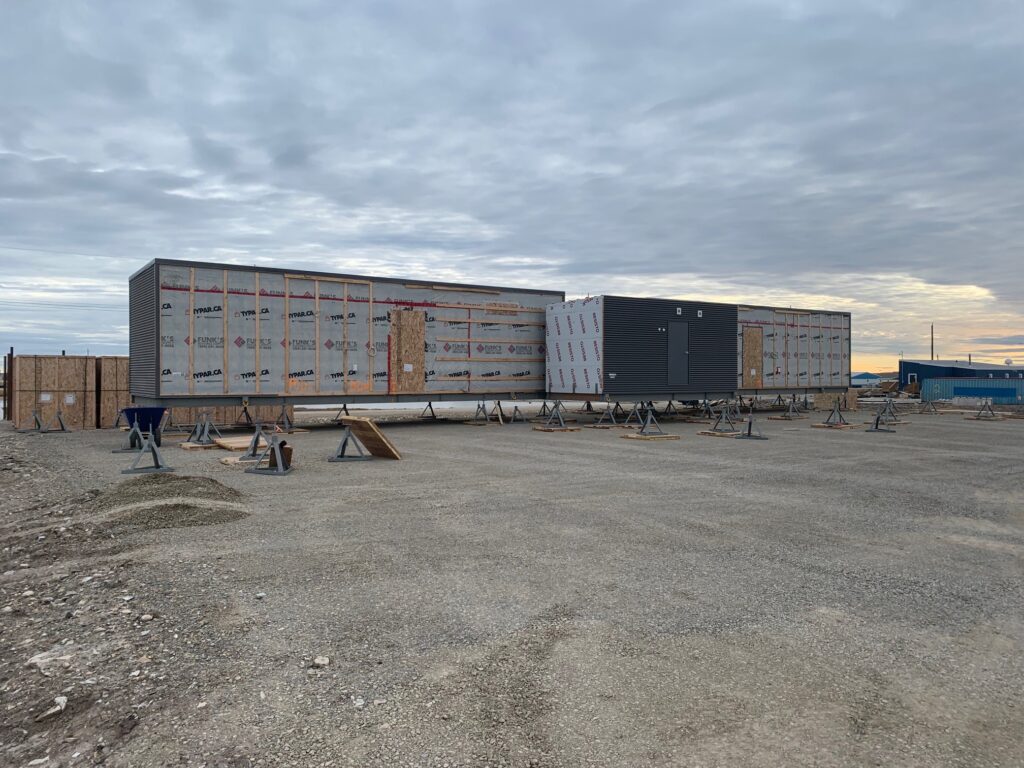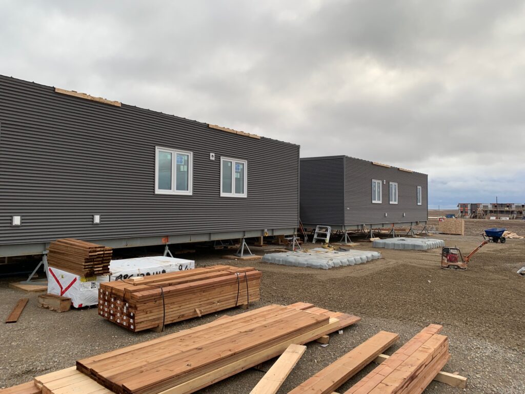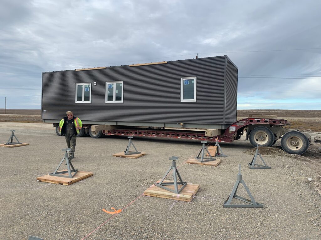 These units are manufactured in Manitoba, trucked to Quebec, and shipped to Nunavut communities. Upon arrival they are trucked to site and lifted onto a piled or jack foundation using a loader, making them a feasible housing solution for these remote areas.