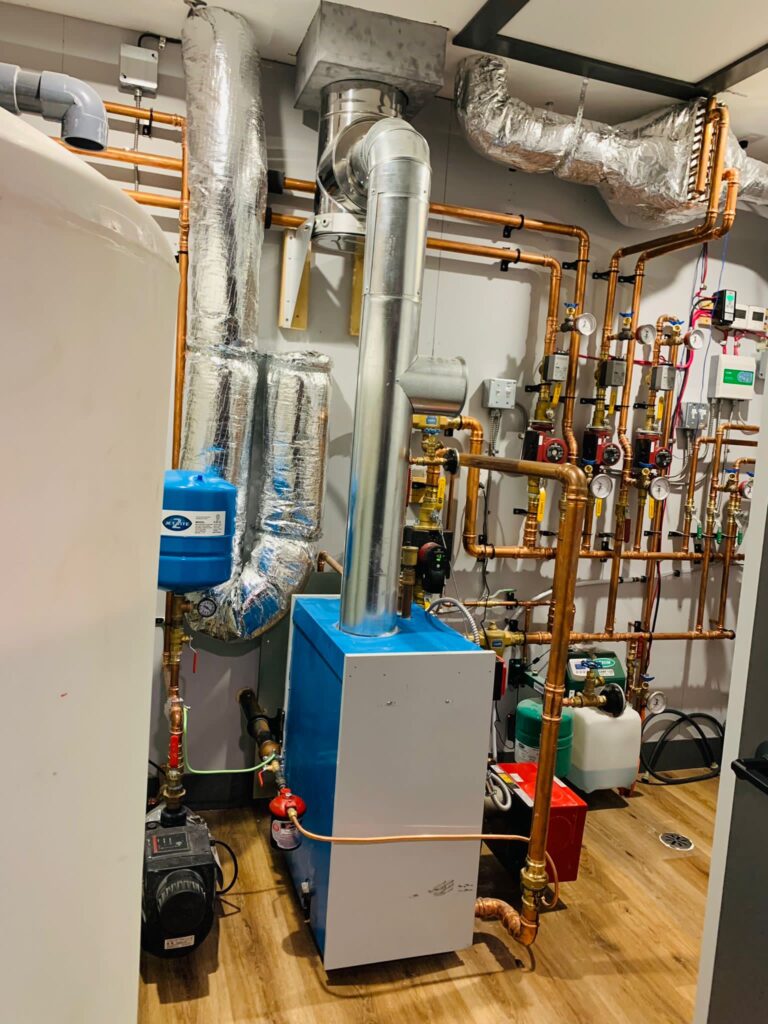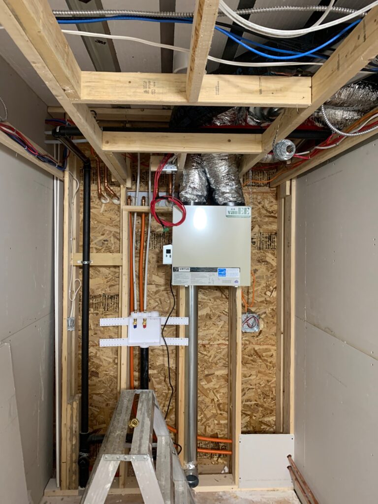- In-floor hydronic heat using an oil fired burner.