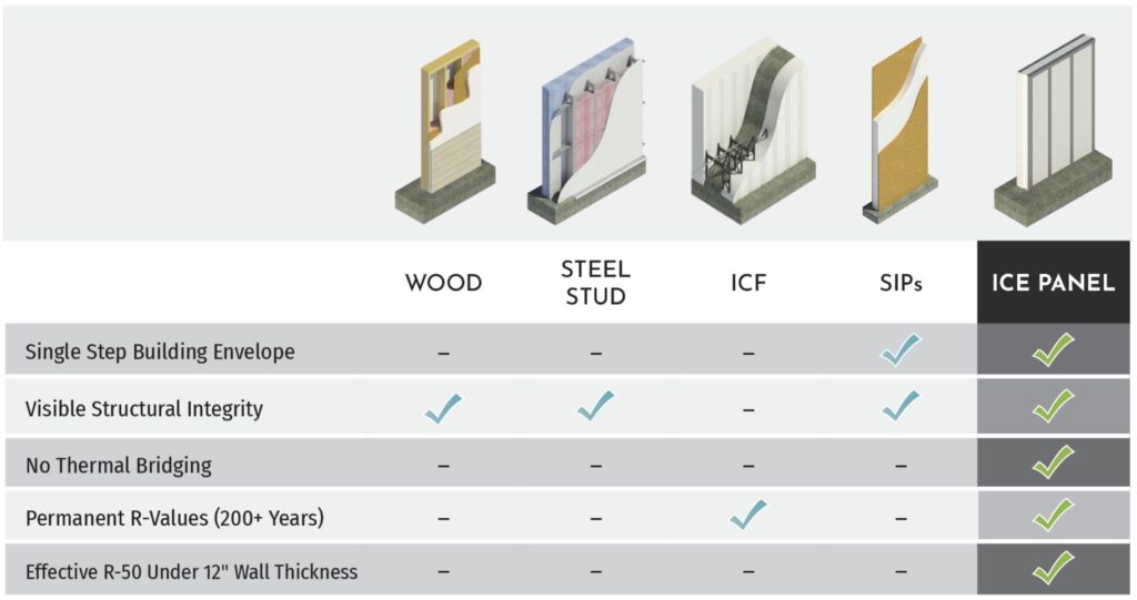 These panels are made of steel and Graphite Polystyrene (GPS), both inorganic materials, providing durability, resistance to warping and cracking, and zero toxic gas emissions. The ICE Panels are also mold and mildew-resistant.